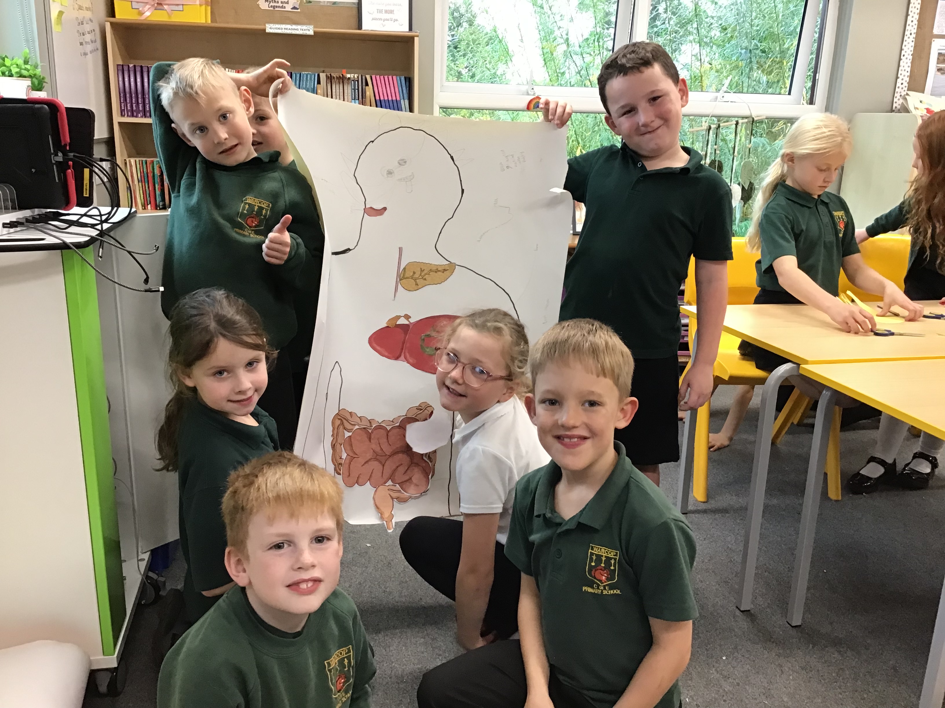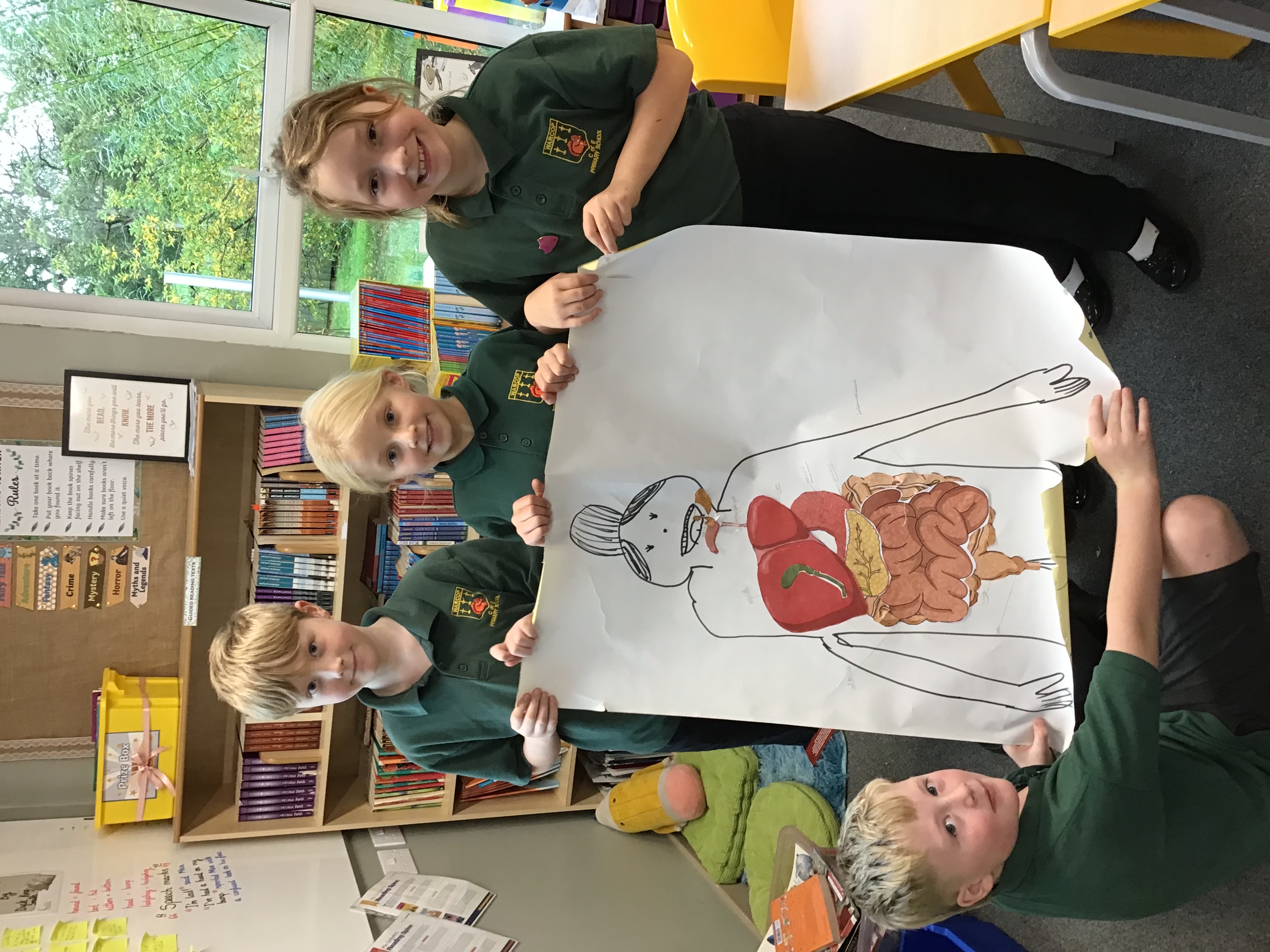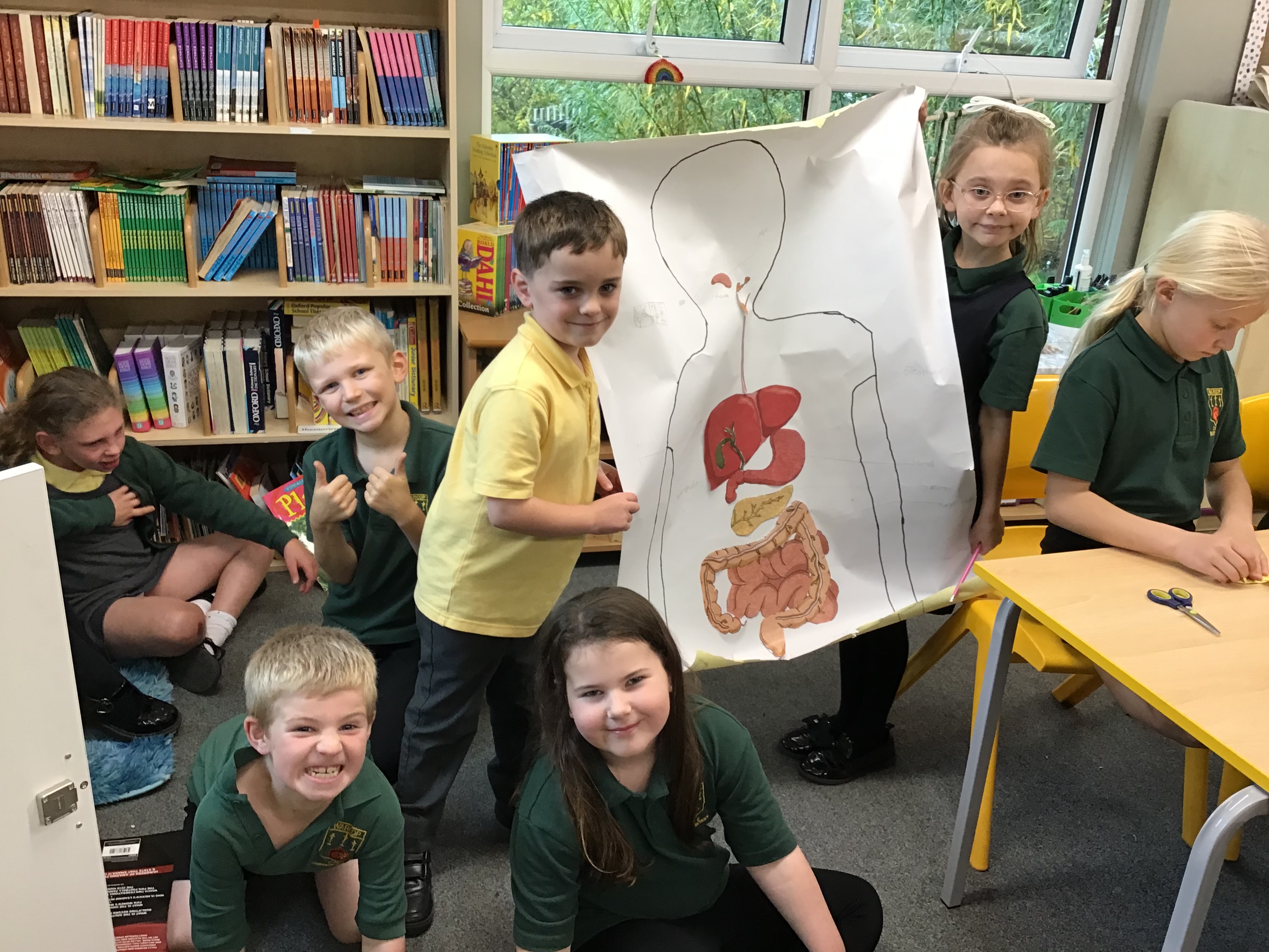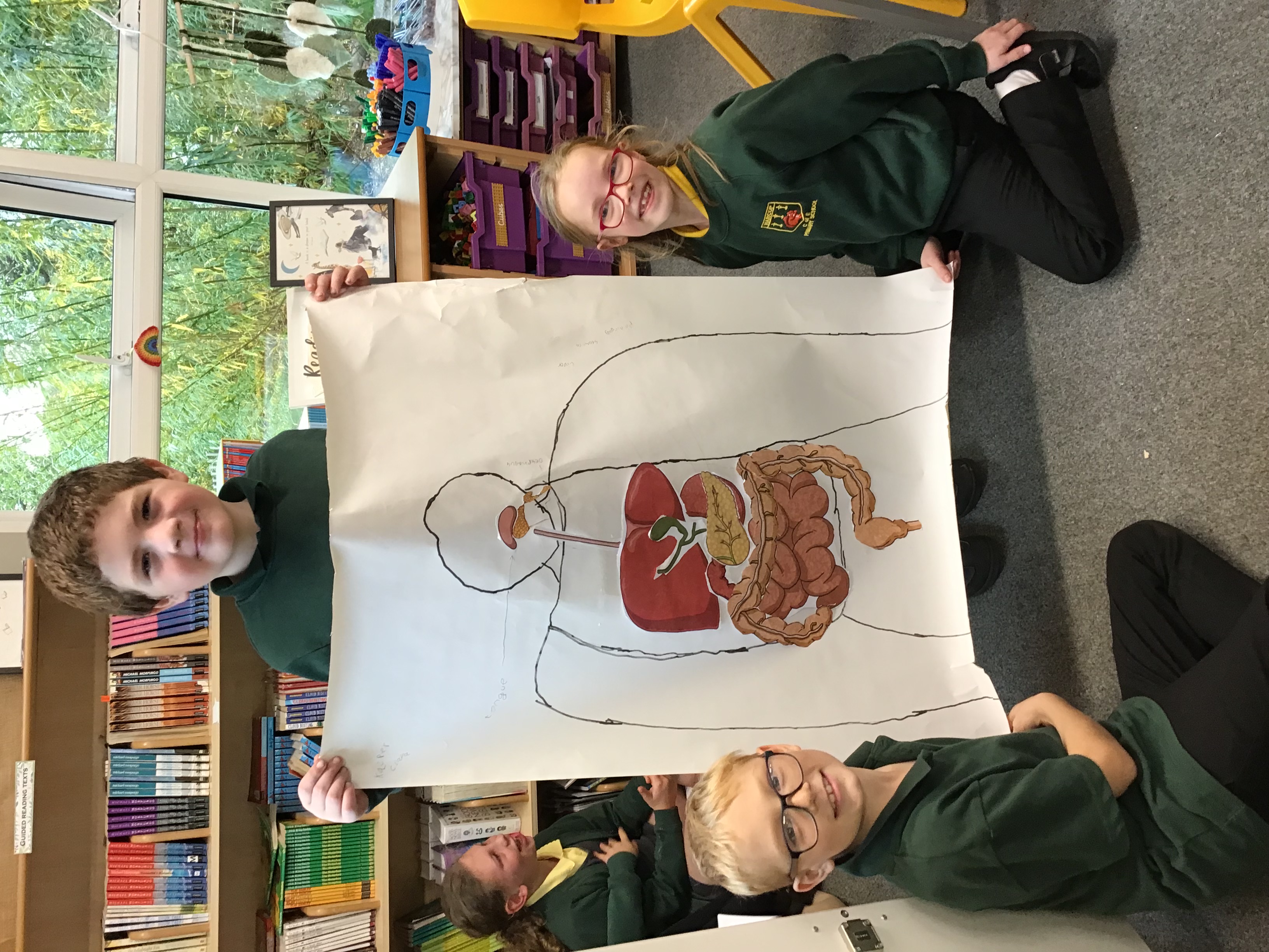 In Science we have been learning about eating and digestion. In the first lesson, we created our own digestive system on the human body in small groups. In the next lesson, we created the digestion process using bread as food, orange juice as acids, the bag as a stomach and tights as the intestines.